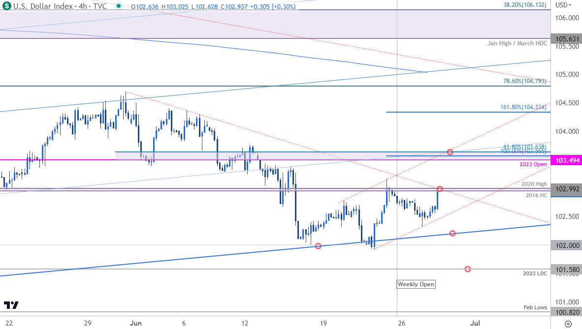 美元指数较月内低点上涨逾1%,DXY目前测试第一个6月下行阻力位。随着价格在月/季度末于年内区间收缩,战线愈发清晰。以上是DXY短期技术图表上重要的最新目标位和研判点位。